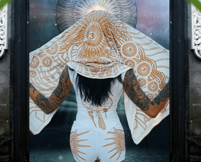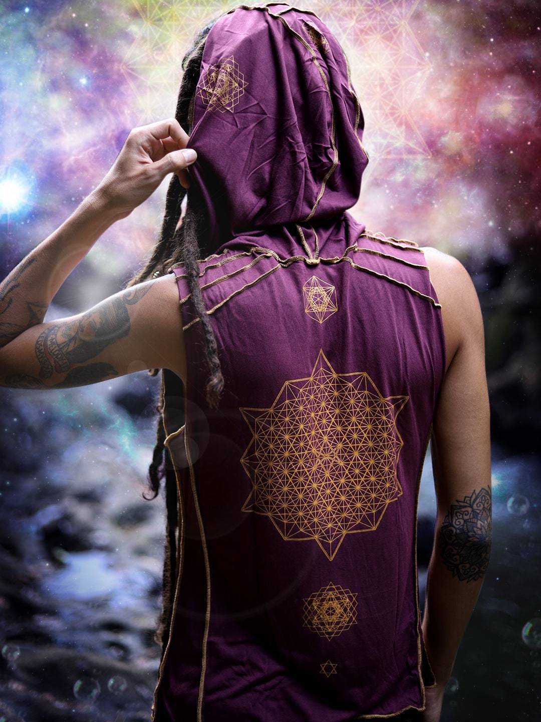 Crystal Infused Sleeveless Hooded T Shirt - Merkaba, Metatron Sacred Geometry Eco-Fashion Festival Clothing Crystal Infused Seed of Creation